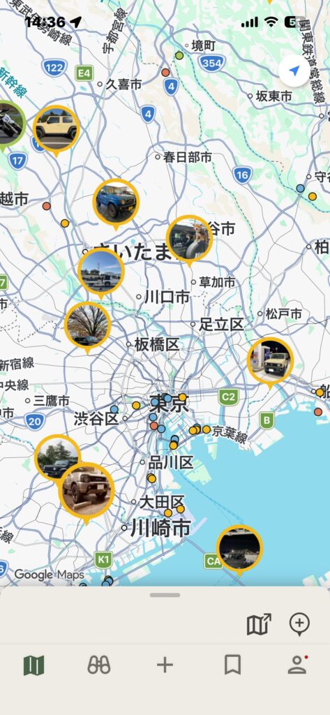 ジムニー関連スポットのピンが写真付きで並ぶようなUIになっております。これは眺めているだけで次の目的地が決まるやつですね!