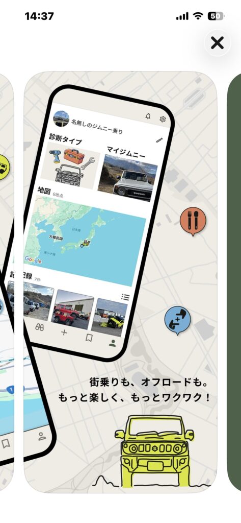 地図に「ジムニーならでは」のスポットを集め、思い出を写真つきで記録し、オーナー同士の遊び方も発見できる——そんな「遊びのハブ」みたいなアプリです。