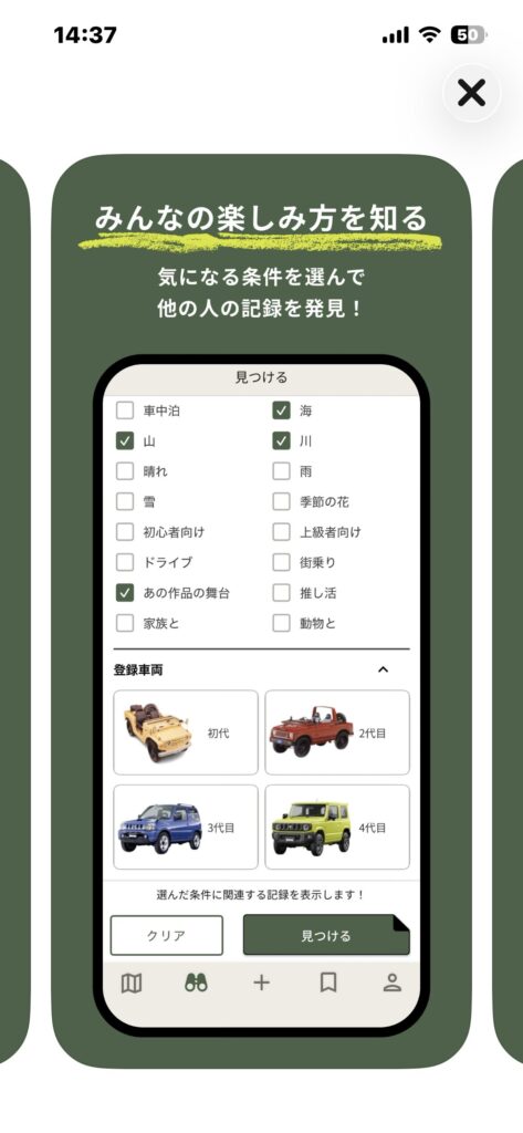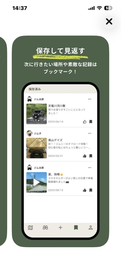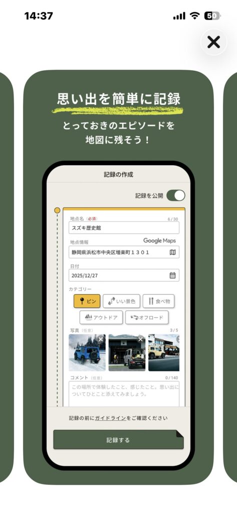 地図で見つける→その場で記録→保存&共有——ジムニーの楽しみが連鎖する導線が一本にまとまっている良いアプリだと思います^^