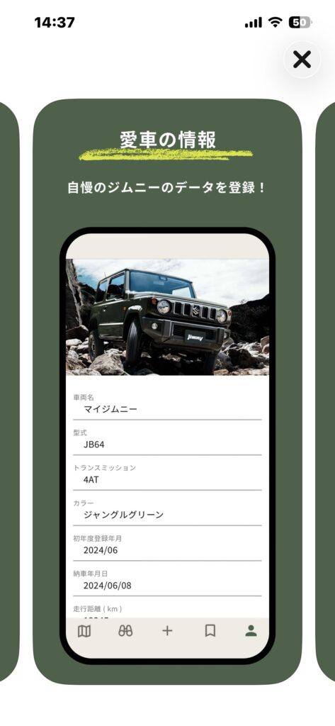 型式/カラー/納車日など、愛車プロフィールを記録。自分の「ジムニー史」を可視化!